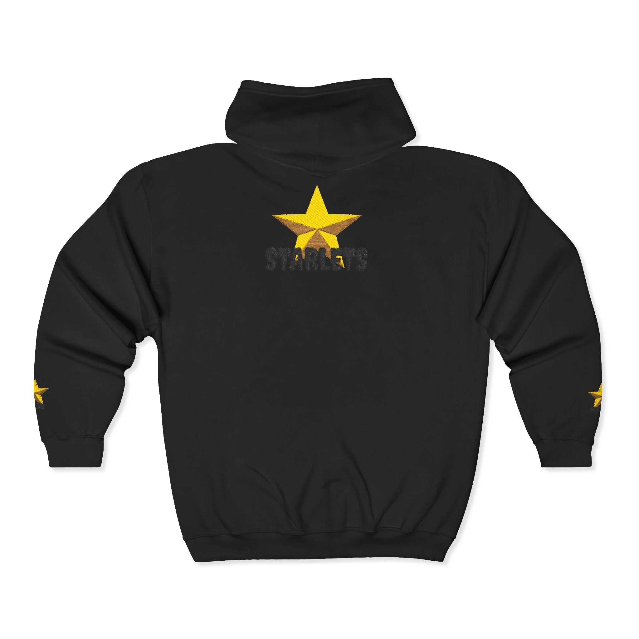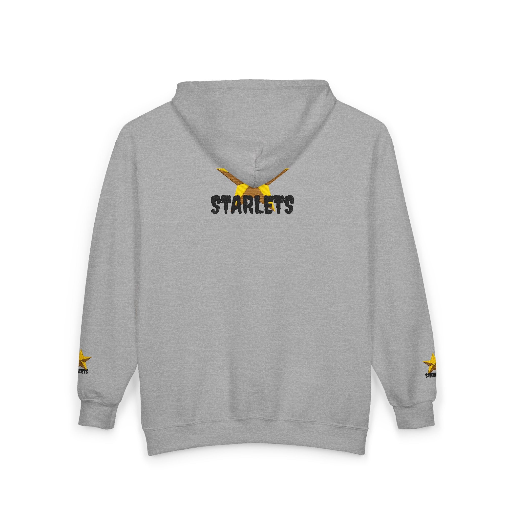 A roomy, midweight zip hoodie that carries quiet confidence. Soft yet structured, its tubular knit keeps lines clean while roomy front pockets and a metal zipper bring everyday durability. A stitched gold star on the chest and larger star on the back add a subtle, hand-crafted feel—like a little badge you wear on days you want to move through the world with steady calm. Wear it over a tee for morning coffee runs, layer it for late-night practice sessions, or pull the hood up on windy drives. The embroidered detail and printed wrist accents make it feel personal, lived-in, and ready for repeat wear.